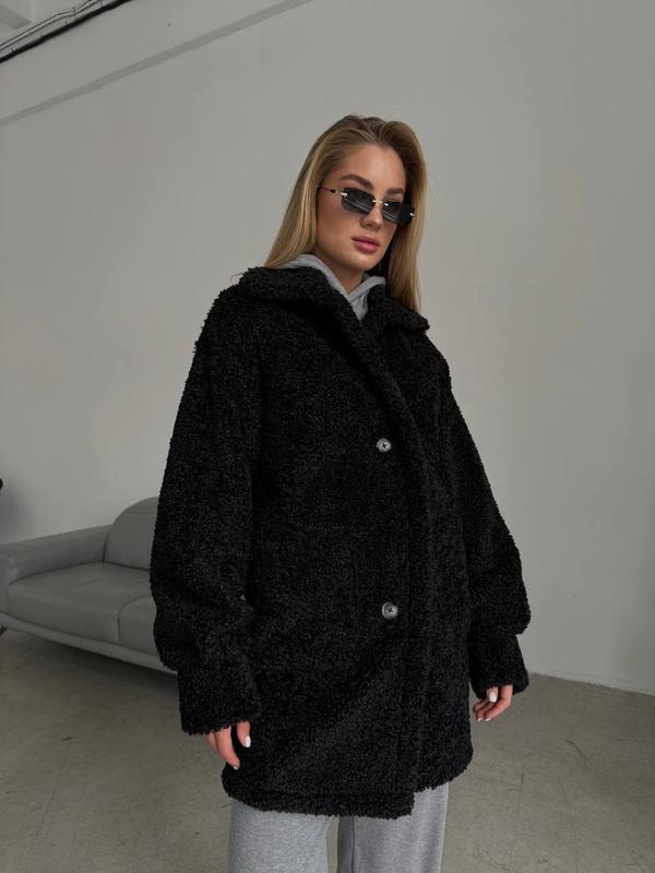 Шуба-дублянка еко-хутро на замшевій основі оверсайз дублянка на ґудзиках, з карманами розмір універсальний 42-46 кольори - чорний, молоко, шоколад (можна замовити 48-50, 50-52 розмір, +200грн