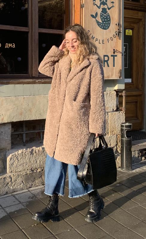 Очень приятная на ощупь, мягкая Тедди шубка из искусственного эко меха бренда Ximo. Имеет три кнопки, внутри напоминает дубленку, карманы без застежек, достаточно глубокие. Цвет серо-бежевый, на первом фото при солнечном свете, на других при комнатном. Очень теплая, было комфортно до -10 градусов На бирке указан размер XXL 175/96A, одевала на размер s/m рост 175 см в виде оверсайза, рукава подгорела. Рукав от плеча около 61 см, длина около 102 см, чуть выше колена. Носила пару раз, продама потому что перестала подходить по стилю.
