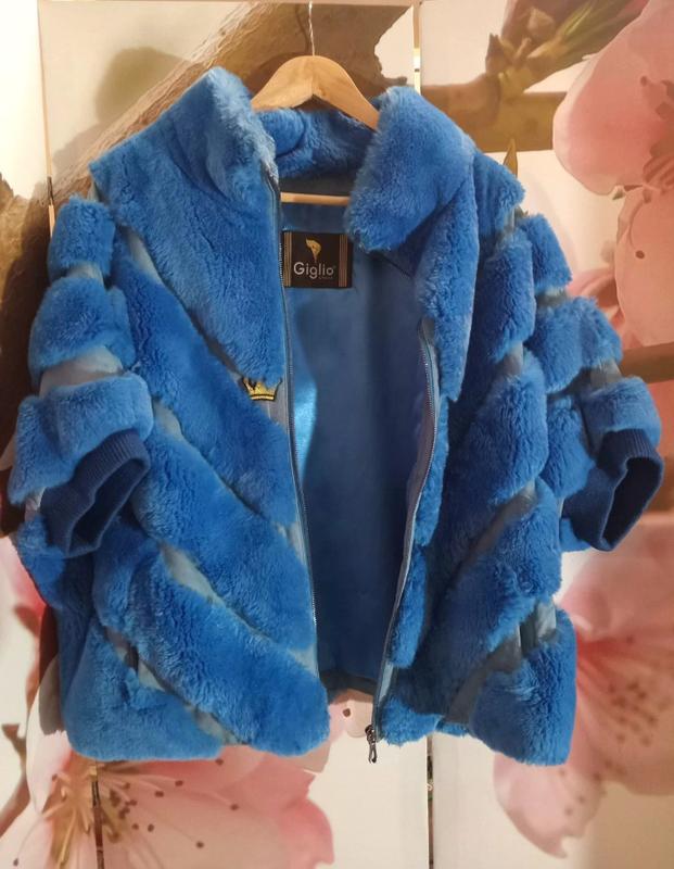 Шуба полушубок из натурального меха шиншили ораллаг, крашенная в свет синий цвет электрик...