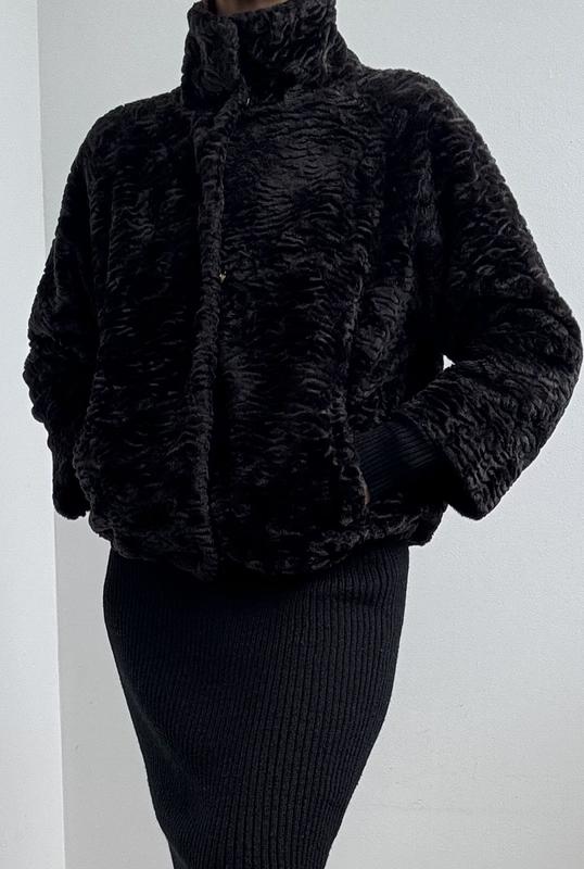 Легенька шубка зі штучного каракуля, колір темно-сірий, коштовний бренд Marella. Є нюанс по низу на підкладці, на фото показала. Зовні без дефектів. Ворот стійка, по низу резинка. Рукав 3/4 Заміри: довжина 54, рукав від горловини 60, пог 55, пот 55, ширина по низу 43/57