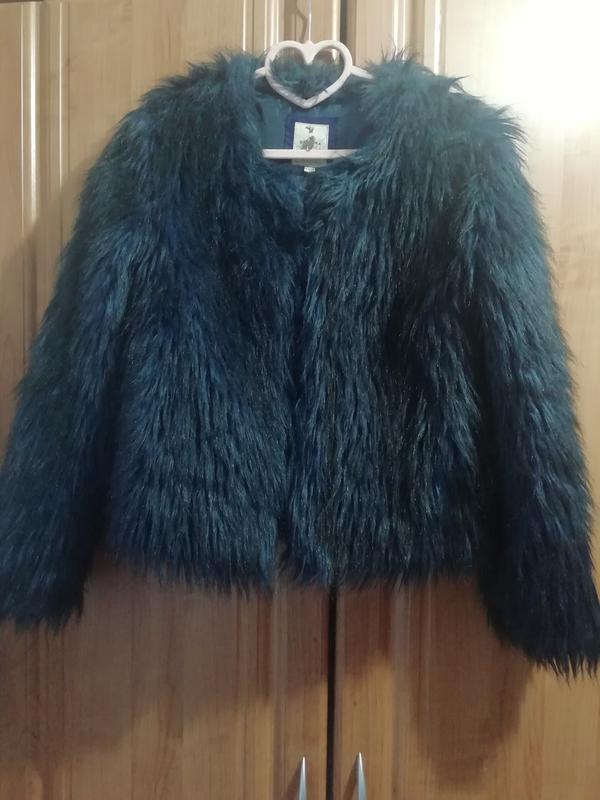Стильная куртка, шубка, жакет из искусственного эко меха, с длинным ворсом "Лама" Иссине-черного цвета. Укороченный свободный крой, без воротника, с длинным рукавом. Застежка-прикрытые крючки. Плечи-40 Рукав-60 ПОГ-48 Низ пополам-50 Длж - 53 см.