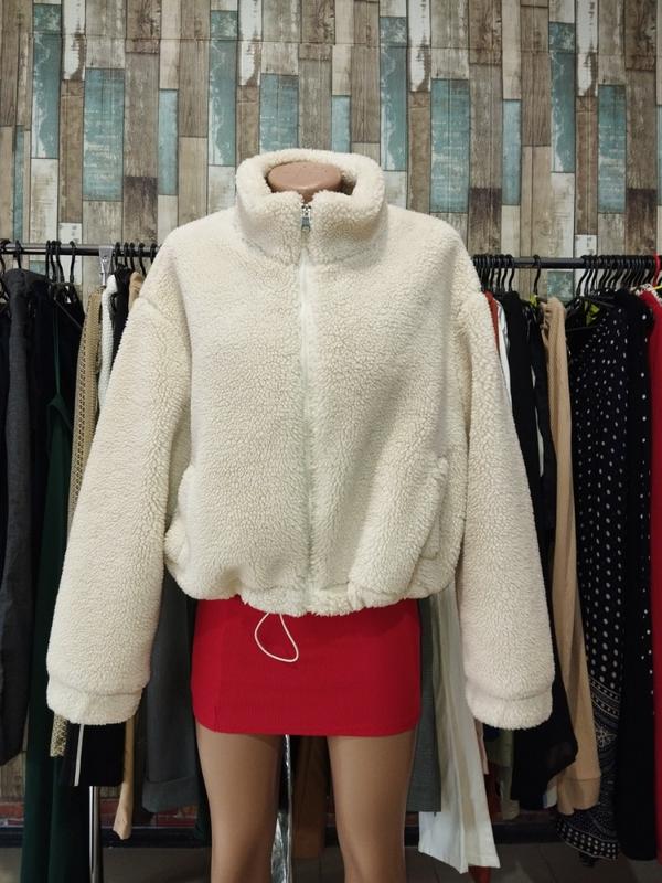 женская короткая шубка Тедди флис, размер XL, молочного цвета, на молнии, затягивается на поясе, карманы без молнии