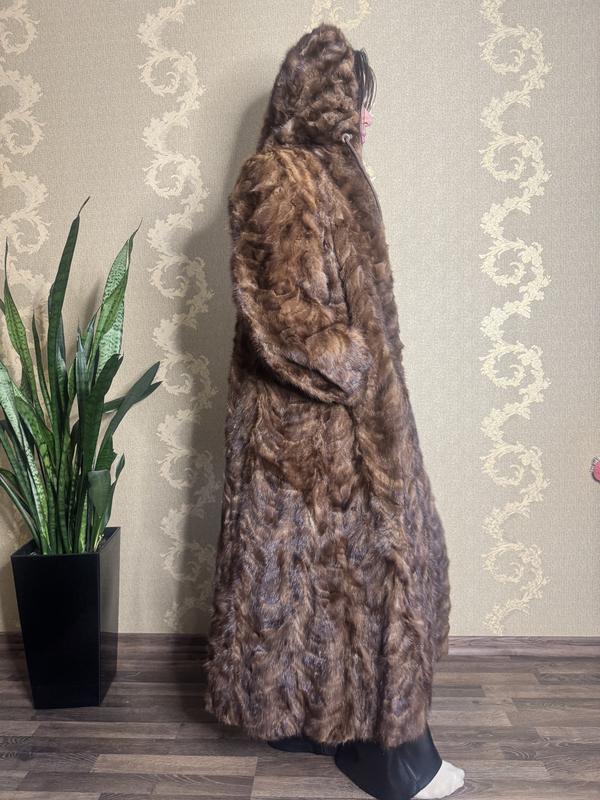 Довга шуба натуральна, тепла, капюшон, кишені, пончики Розміри у галереї, на фото шуба на людині 170см і розмір L-XL Є потертості, декілька місць, де треба зашити