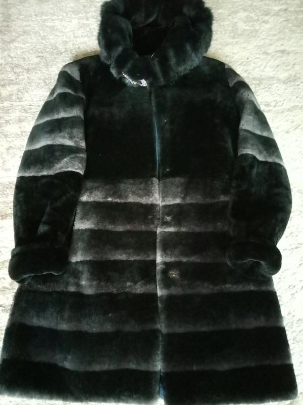 Длина чуть выше колена при моем росте 172 см, снизу и на рукаве темно серые полосы (на фото смотрятся чуть светлее). Затертостей нет. Размер 50. Замеры шубы: длина рукава 72 см (можно подворачивать скольео нужно - внутри на манжете мех); длина плеча 12 см; длина по спине 92 см; ширина по спине под проймой 57 см; ширина рукава 22 В сложен. виде ширина низа 132см Ширина по бёдрам 118см (замеры делала нутри от края до края