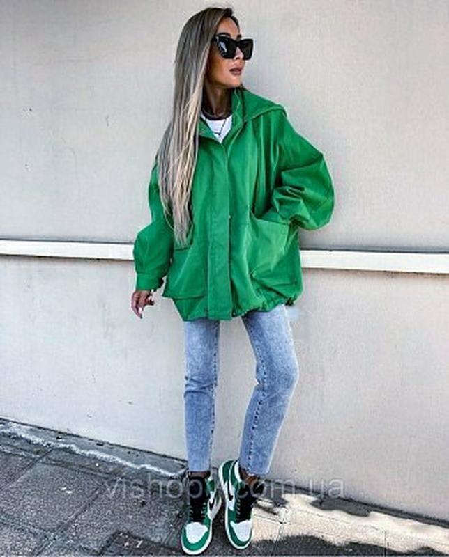 Довжина виробу 77, від плеча до плеча 60, довжина рукава 51, об'єм грудей 132 см. Жіноча об'ємна куртка з водонепроникної тканини, у яскравому зеленому кольорі з капюшоном. Попереду має чотири великі кишені, дві з них застібається на блискавку. Ширина рукава знизу регулюються паском на липучці. Перше та останні фото з сайту для передачі вигляду на фігурі.