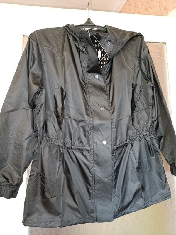 Ветровка черная. без подклада. молния и кнопки. карманы спереди обманки. кулиса на талии (в середине можно регулировать) удобный капюшон на резинке надпись на спине закос под балентяга. на фото пришлося зарисовать) длина 70см ширина 56см (талия регулируется)
