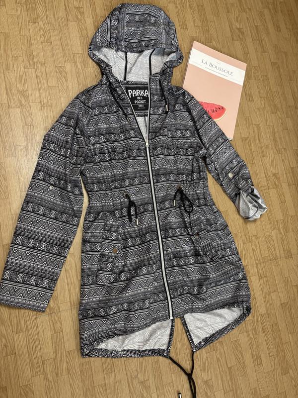 Класна жіноча вітровка Atmosphere 🌧️ ✔️ З капюшоном ✔️ Регулюється по талії шнурочком ✔️ Рукав довгий або можна підкочувати — фіксується кнопкою ✔️ Водостійка, тканина м’яка. ✔️ Розмір вказано S, підійде і на M 📏 Орієнтовні заміри: • Довжина по спинці — 83 см • Довжина рукава від капюшона — 70 см • Обхват під мишками — 98 см 🔸 Стан ідеальний, як нова — одягнена 1-2 рази максимум! Ідеально підійде для осені 🍂 або прохолодного літа 🌬️