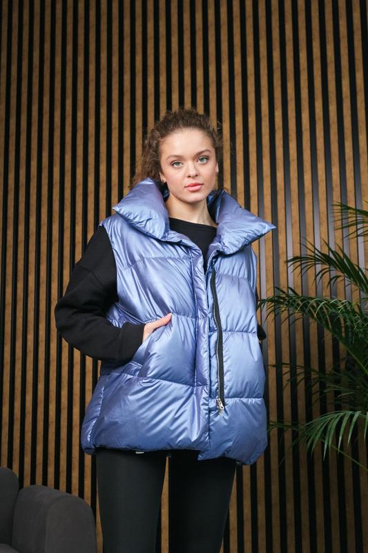 Легкий и объемный жилет “Zefir”: - материал: плащевка; - наполнитель био-пух; - в жилетке есть два стандартных прорезных кармана по бокам; - застегивается на молнию; - Снизу жилет регулируется эластичным шнурком с фиксатором.