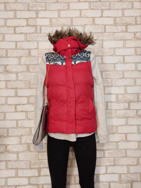 Балоневая жилетка с капюшоном (мех под енота) в крсном цвете, размер с-м