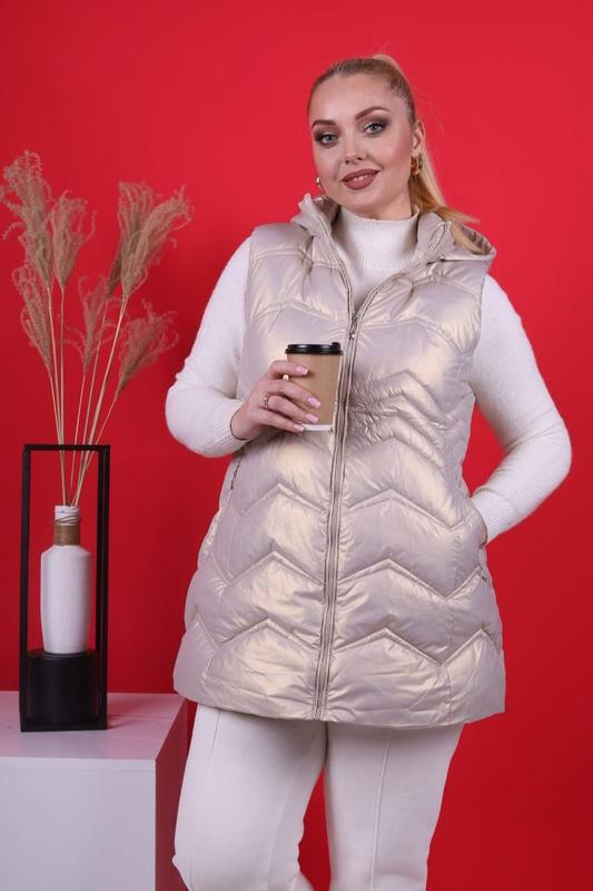 Красивые женские жилетки. Демисезон Удлиненные. С капюшоном, капюшон отстегивается. Застегивается на молнию. По бокам карманы на молнии. Материал: плащевка, синтепон 100 Размеры: ХL (~46) 2XL (~48)❌ 3XL (~50)❌ 4XL (~52)❌ В скобках примерные наши размеры, замеры на фото. На модели р.3XL Параметры модели: 102/79/112, рост 173 Цвет: бежевый перламутр