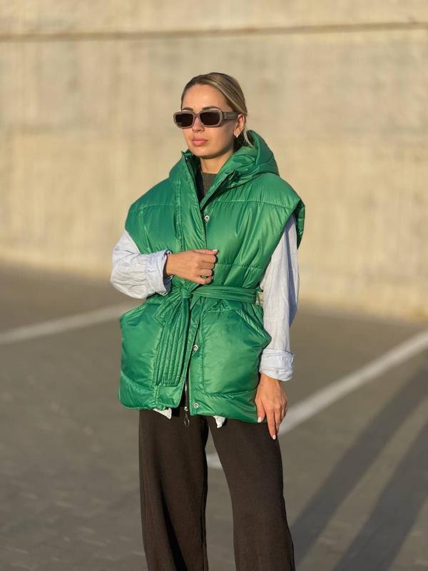 Жилетка Цена - 880 грн. Ткань: плащевка+ плотная подкладка+силион 250 Размеры:42-44, 44-46 Цвета: зеленый, графит, черный, белый Жилетка с капюшоном, в комплекте идет пояс. Застегивается на молнию и кнопки, есть карманы. Подкладка также из плащевки * Безпечна оплата * Накладений платіж - по передоплаті 200 грн. * Обмін/Повернення: Товар, обов'язково перевіряти на пошті! Якщо причина відмови наша помилка (виробничий брак, не той розмір/колір) - доставка за наш рахунок. Якщо ні, то доставка за рахунок покупця, і передоплата в такому випадку не повертається.