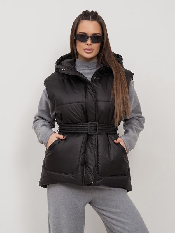 Чорна утеплена жилетка зі знімним поясом, виготовлена з плащової тканини на синтепоні. Модель асиметричного вільного крою з капюшоном та кишенями. Блискавка жилета з клапаном на кнопках. Розмір: S, M, L, XL Колір: Чорний Матеріал: Плащівка на синтепоні Склад: 100%, поліестр