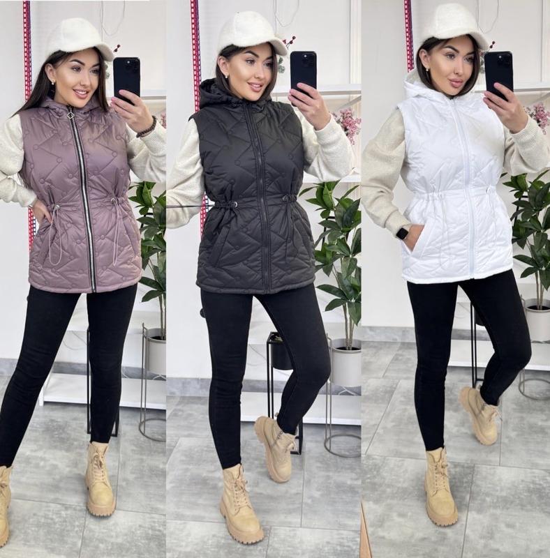 Жилетка Арт. 5/0041/8/7 Цвет: черный, белый темно-сиреневый Размеры: S, M, L, ХЛ, 2хл Тканина: плащівка Лаке+150-й СИЛіКОН Описание: Стильный жилет с капюшоном, талія на кулісці. Комфортный крой, подойдет под все стили. Качество (вамерах указаны параметры человека)