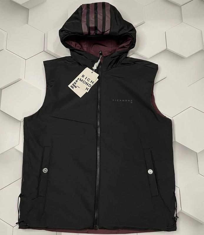 Женские двусторонние жилетки Richmond. Оригинальный. Жилетки черно-бордового цвета с капюшоном. Стильны. Размер 48, 50,50, 52, 54, 56. 48 Плечи 49 ПОГ 58 Длина проймы 28 Длина 71,5 Ширина внизу жилетки 57 56 Плечи 55 ПОГ 67 Длина пройм 33 Длина 75 Ширина внизу жилетки 66