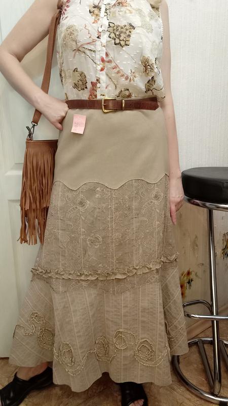 красивая юбка в стиле "бохо" хороший бежевый нейтральный цвет на основе хлопка 89% не дает усадку. хорошо держит форму указан двенадцатый размер ✔️талия 80 см ✔️Бедра 102 на боку молния и маленькая пуговичка с петелькой без подкладки ✔️длина 94 см продам з блузкой уступлю.