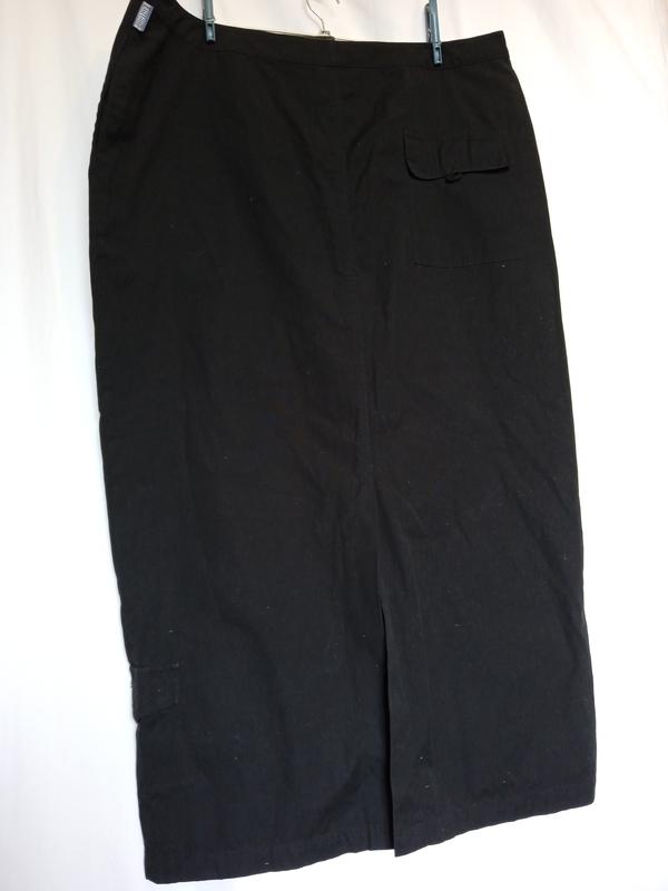 юбка красивая, стильная, в отличном состоянии,черная,длина94см,бедра64,пояс50-52,на липучке, шлица сзади40см,ширина по низу56см, карман накладной на липучке на задней части, меньший накладной карман на липучке внизу сбоку, два кармана в боковых швах в верхней части юбки