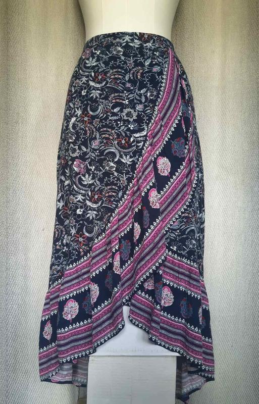 100% вискоза Женская вискозная летняя длинная натуральная юбка на запах, мелкий цветок штапель тропический принт в одном размере, размер указан 14, но может подойти на больший размер измерения: ПО пояс -41-58 см, резинка, бедра 65 см, низ свободно Длина от пояса – сзади 101-102 см, по боковому шву 87 см, спереди 65 см, ширина волана 22 см Не тянется состояние нового.
