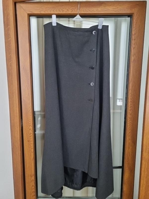 Интересного кроя юбка на боковых пуговицах, А-силуэта, по переду короче, достаточно длинная. Замеры: пот-36, пост - 54, длина по переду - 76, по спинке - 88