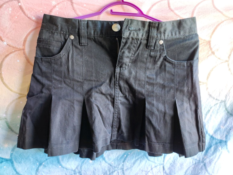 Виробник: Інший виробник Джинсова міні спідниця чорного кольору у складку. Бірки з розміром нажаль немає, але по замірам десь на розмір С. Заміри ПОТ-38см, ПОС-46см, довжина-35см.