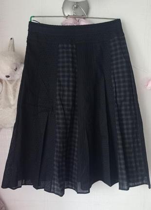 Очень красивая дизайнерская обильная юбочка, интересный крой, комбинированные ткани различной фактуры, жатая, клетка, в дырочки. Максимальнотирала снимок, чтобы было понятно) Стан новой вещи. Подкладка, потому что верх тоненький, дышащий и светящийся. Состав - хлопок. Размер - 16. Замеры - талия - 45, бедра - 60, длина - 83. Цвет 10 из 10.