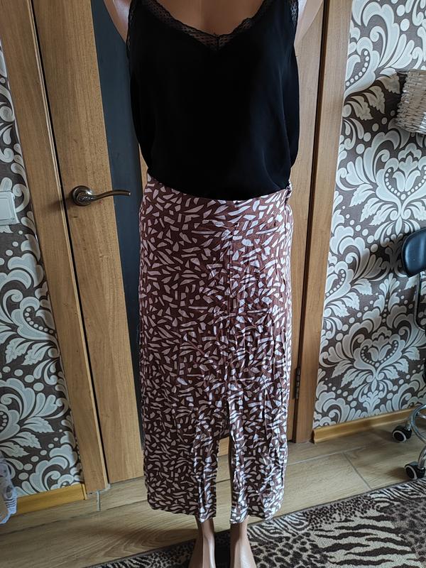 Женская штапельная юбка в 46 размере, но будет на 44 см. замеры. Пояс полуобхват 34, но сзади есть резинка, которая чуточку тянется, длина 75