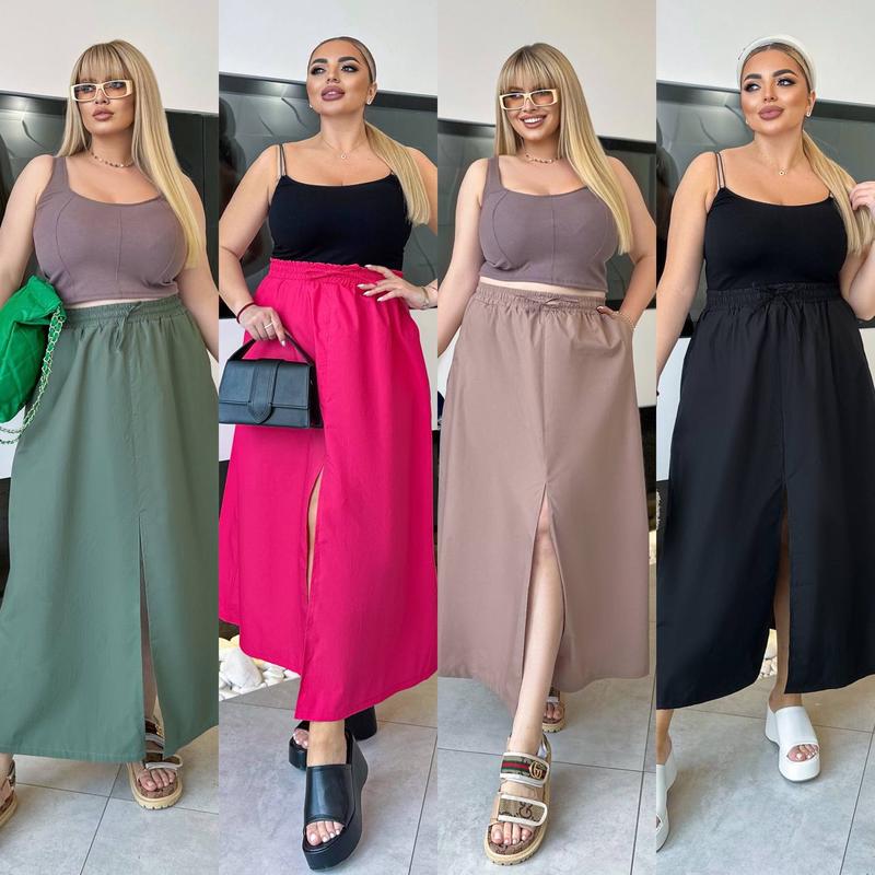 Комфортная и свободная юбка из коттона, идеально для жаркого лета Размеры: 48-50, 52-54, 56-60 Юбка из летней натуральной ткани - коттона. С карманами в боковых швах. Пояс на эластичной резинке. Поясок-затяжка на талии. Разрез спереди посередине. Цвета: малина, черный, мокко, хаки