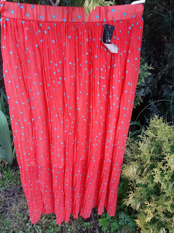 Юбка длинная 92-93см длина, размер универсальный, очень классно тянется подойдёт к размеру, оранжево-розовому цвету, будто в виде кораллового горошек ободно голубой