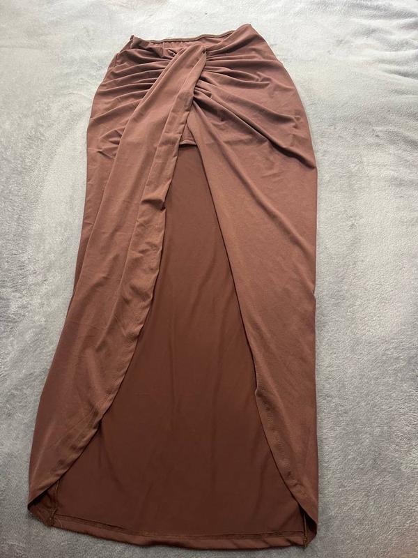 Длинная коричневая юбка с высокой талией. Имеет высокий разрез спереди и драпировку на талии. Выполнена из эластичной ткани. Размер XS-S-M