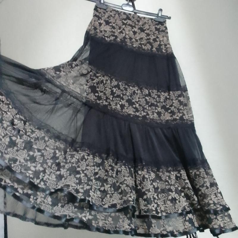 повітряна спідниця на гумці та на легкій еластичній підкладці, квітковий бежевий принт на еластичній мікросітці + мікроблискітки по принту та мереживом між ярусами. підходить для 34-38 розмірів. тт — 32 см НОС — 47 см талія та стегна (перший ярус від талії) тягнеться до 104 см. довжина — 93 см підкладка закінчується перед нижнім двошаровим квітковим ярусом, що надає прозорість і легкість низу.