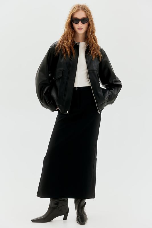 1850 Юбка из саржи с молнией и пуговицей. Облегающий модель с низкой талией, с косыми карманами и декоративным карманом сзади. Прямой низ с выраженным разрезом сзади. Без подкладки. Артикул №: 1268136004