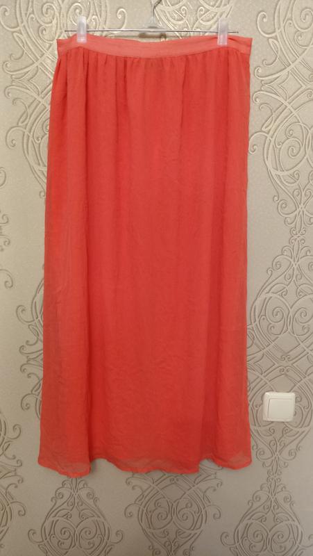 Легкая, шифоновая юбка макси на подкладке. Пояс сзади на резинке. Длина -96см, пояс-42-54см. Ткань очень мягкая, похожая на шелк.