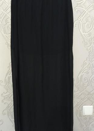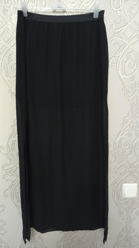 Длинная шифоновая юбка на подкладке. По бокам разрезы-75см, длина -106см, пояс на резинке-40-55см, длина подкладки -36см. Ткань очень мягкая, приятная на ощупь на языке шелк.