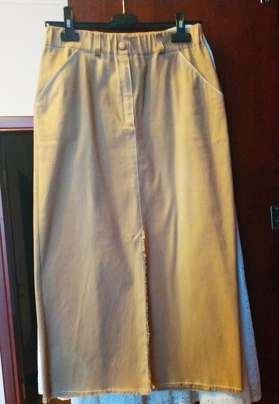 Стильная юбка из натуральной ткани, коттон-джинс, немножко тянется. Подойдет на размер М, небольшой L. Возможна примерка, если вы из Франковска. Длина 82 см, по бедрам 49 см, по талии 36 см. На талии резинка, и ткань сама чуточку тянется.