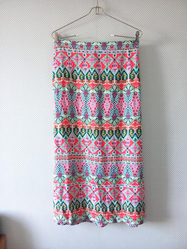 Летняя яркая легкая юбка из вискозного штапеля. Имеет по бокам два разреза. Пояс по спинке эластичный. Стан идеален. Размер по набору 14. Замеры: талия - 40см, бедра - 58см, длина - 89см.