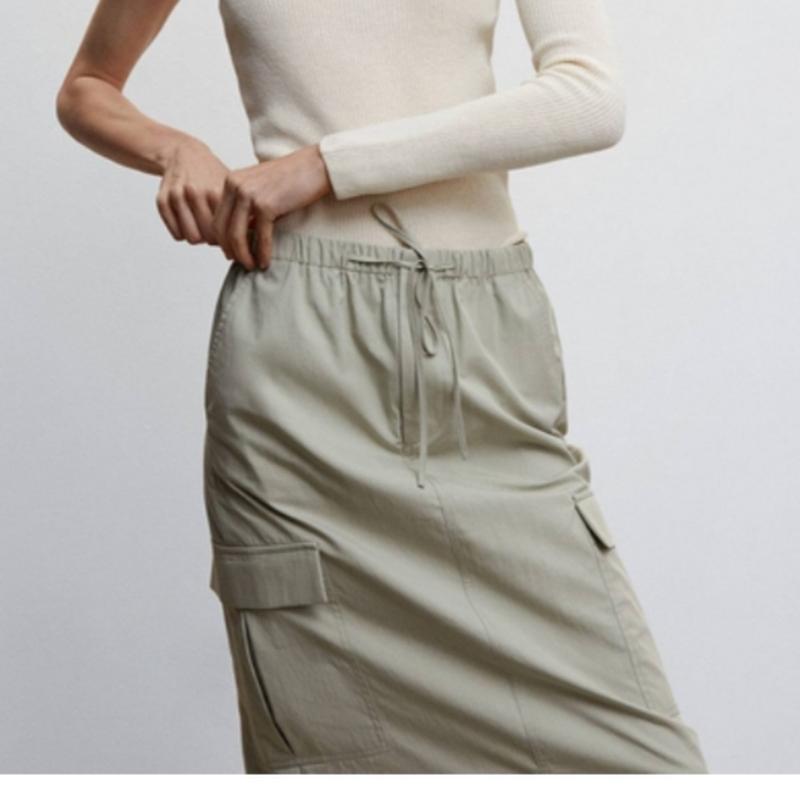 юбка карго от известного немецкого бренда Dazy, длина мидакси, красивого серого цвета гальки, имеет боковые прорезанные и накладные карманы, пояс эластичный плюс шнуровка, сзади разрез, составляющий 100% полиэстер плащевка, размер XL, но маломерит поэтому пойдет на L, замеры на фото