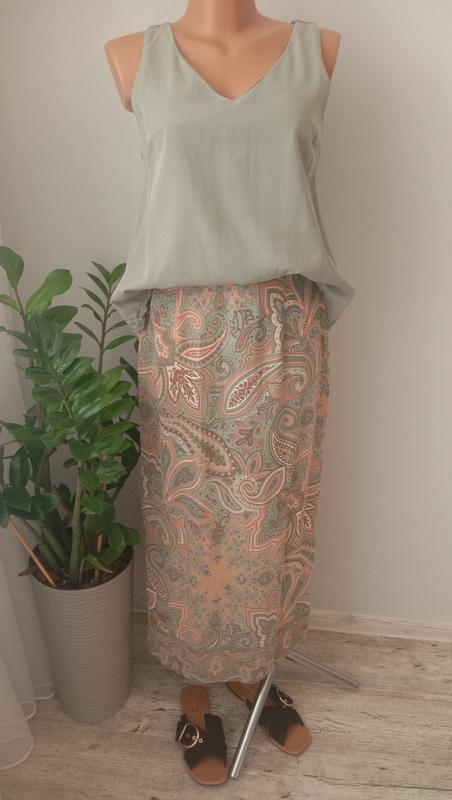 Отличная, легкая юбка. Стан идеален, сзади есть разрез, на подкладке. Вискоза. Размер S. Длина 89 ПОТ 33 ПОС 48 Высота разреза 34