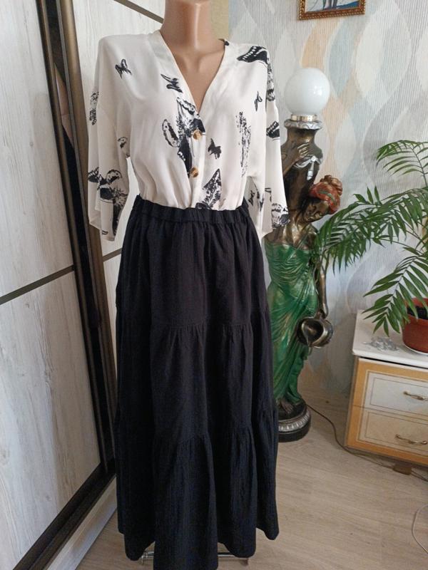 Черная,длина юбка,нярядно и стильно смотрится на фигуре,стан идеален, безposансиа ПОТ в растянутом виде 42,ПОК под резинку 30, длина юбки 92
