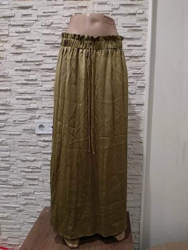 Красивая юбка цвет оливки, ,свободный крой, приятная ткань хоть и полиэстер,верх с блеском, ткань немного с плессировкой,верх на широкой резинке что удобно,длина-95,пот-36,тянется-52,поб-73