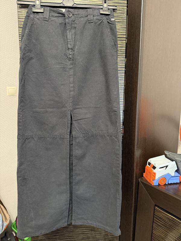 100% котон, розмір пише С, але див заміри Спереді розмір, є кармани Пояс-резинка, тому добре тягнеться, ПО пояса з самого верху в не розтягнутому вигляді 35 Довжина 94,5 Довжина розрізу 53,5 ПОБ 45