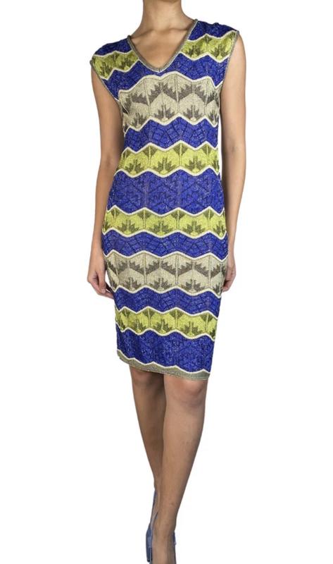 Трикотажна сукня з люрексовою ниткою люкс бренд Missoni В’язка відомим знаменитим зігзагом будинку Мissoni Сукня має підкладку Бічна бірка зрізана , склад по опису цієї сукні з сайту -64% поліамід, 28% котон, 7% металік, 1% поліестер. Підкладка — 100% поліестер. Ідеальний стан Розмір S/M ПОГ 45 тягнеться ПОТ 36 ПОБ 45 Довжина 105