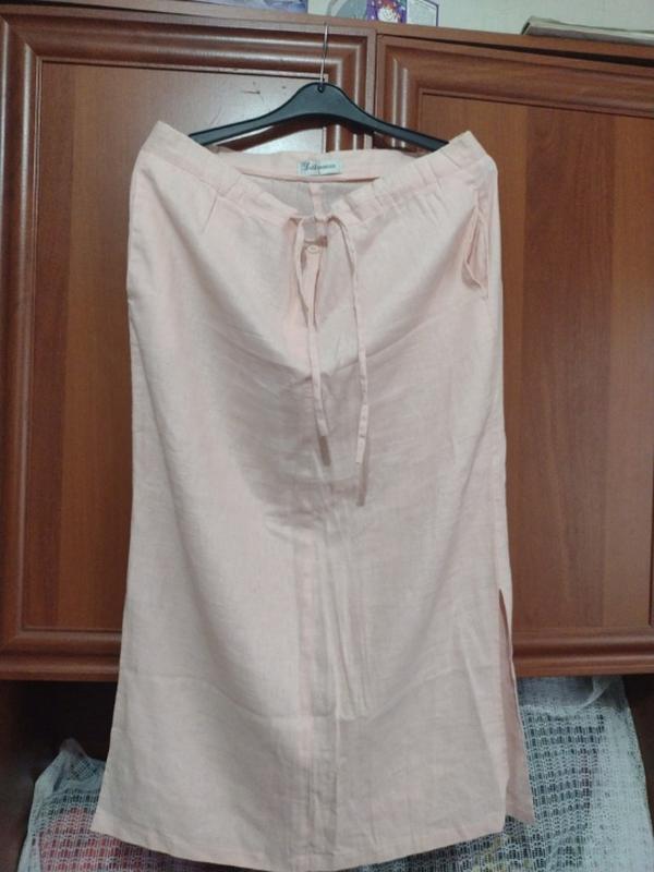 Длинная ляная юбка на завязке на молнии с разрезами по бокам. Есть карманы. Есть маленький нюанс резинка широкая и что в поясе потрескалась в середине но это не замстно при носке. Довжина 82 см. пот 47 см.поб.52 см. Длина реза 28 см