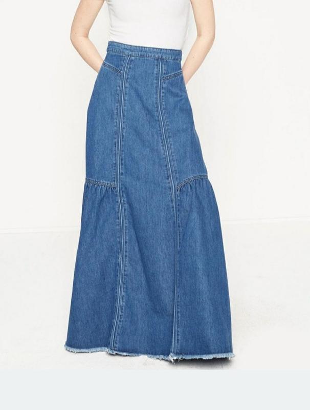 Оригинальная джинсовая юбка А-силуэта на высокой посадке,100%коттон, имеет боковые карманы, сзади на молнии,36 разм.,пот 33см,бедра 55см,длина 115см,сток с бирками