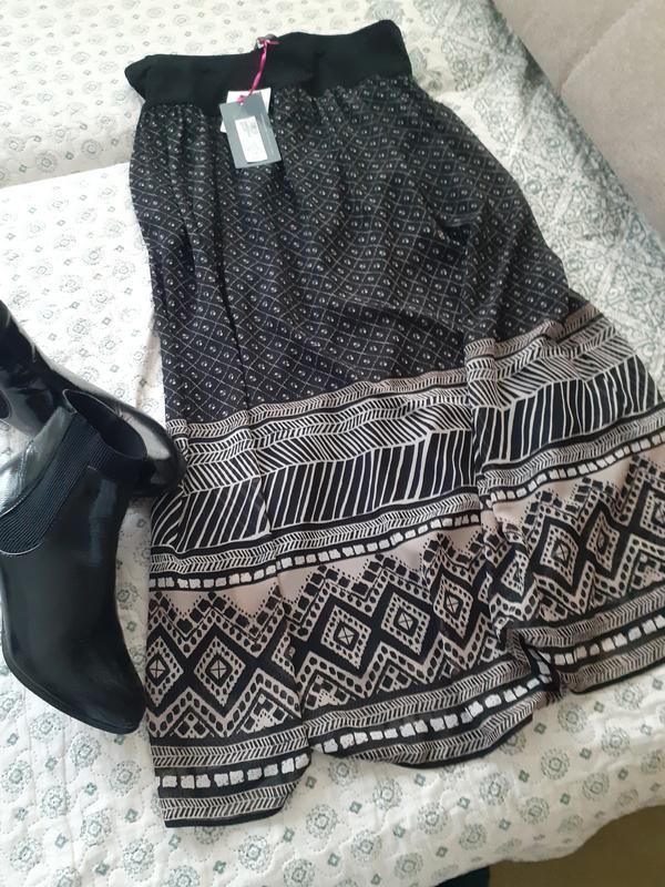 Юбка макси Per Una с графическим принтом, очень элегантная. Длина макси- всегда актуальна и универсальна. Юбка имеет пояс-вставку ткани вискозы 95% и 5% эластана, из-за чего не вздымает, делает четкий акцент на талии, а от вставки она чуточку аккуратно присборена, силуэт с легкой расклешенной плавно двигающейся при ходьбе. Основной материал -100% полиэстер - это легкая воздушная ткань, хорошо держит форму, практичная в уходе. Структура мягкая, струящаяся, создает плавное движение. Юбка имеет подкладку, чтобы не просвечивалась. Размер указан 12, ПОТ-38 см, благодаря резинке, которая вставлена в пояс, может быть и более, длина 89 см. Юбка можно носить в любой сезон и с зимними сапожками, так и с ботильонами и кожаной курткой, так и с босоножками. Ваш выбор. Смотрите другие Мои объявления есть много интересных вещей, которые вам обязательно понравятся! Отправка по Новой почте, или Укр-почтению после оплаты на карточку. Смотрите другие Мои объявления есть много интересных вещей, которые вам обязательно понравятся!
