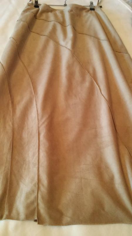 Длинная юбка под замшу, ткань "масло". Очень красивого и актуального песочного цвета. Поскольку не удавалось камерой уловить цвет, цвет фото 2-3. Замеры: ПОТ-40, ПОБ-54, длина -90. Размер L, состояние новой.