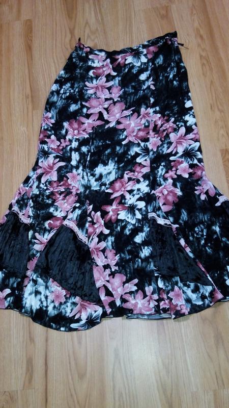 На черном фоне прекрасные цветы, клинья черная жатка с розовым кружевом. Фасончик годе в пол. Очень легкая, летящая. Длина 96 см.,ПО пояса-37 см., ПОБ-54 см.,