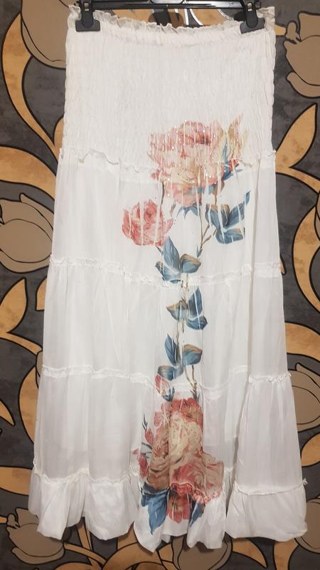 Интересная и красивая юбочка в пол с красивым рисунком.Размер С-Л 42-46,за счет эластичности пояса и свободного пошива.Снизу подьюпник.Пояс широкий и хорошо держит талию.Состояние хорошее(есть не большие зацепки,но в визуально за счет пошива,не видно никак-цена соответственно)). Замеры на фото.Талия сплошная резинка (на 2 фото показано как тянется)