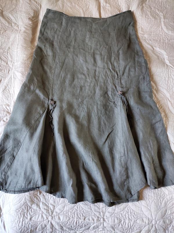 100%лён Длина ниже колен Застегивается на потайных замка Замеры: длина 85 бедер 54 По поясу 43