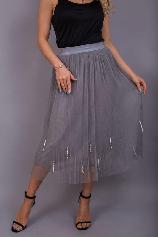Юбка-плисе из фатина - несомненный тренд этого сезона! Модель идет на поясе-резинке, также имеется подкладка и два слоя фатина, верхний слой в мелкое плисе. По низу изделия украшения из белых бусин органично вписанных в плисе. Такую юбку можно комбинировать и с босоножками, и с кедами, дополнив образ блузой или маечкой из шифона