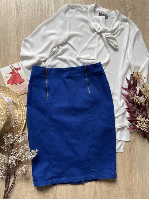 Яскрава синя спідниця «електрик» Класичного пошиття олівець Спереду цікаво защипається на дві змійки Тканина стрейчевий котон, цупкий, але тягнеться Пот 34 Поб 43 Довжина 55