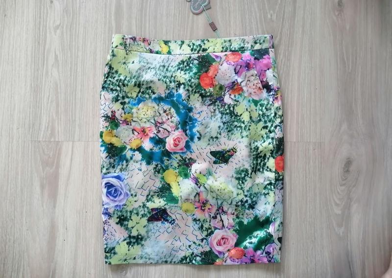 Новая красивенная юбка, плотная атласная ткань, стрейч. Бренд axel, Греция. Размер м-л. На бирке л. Есть карманы по бокам и шлица сзади. довжина по боковому 58,5 см, пот 43,5 см, поб 50 см, у талії тягнеться зовсім трошки, у бедрах більше. Микроскопическая затяжка по буйному рисунку, не заметна.